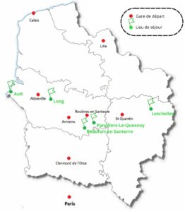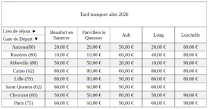 Les arrivées sur le lieu de séjour sont prévues le samedi à 14h. Les départs le vendredi suivant à 16h. Si vous ne pouvez pas déposer et/ou récupérer votre enfant, des transports en train sont organisés des gares suivantes : L’ accompagnement en train est organisé par nos équipe et entraine un surcoût calculé en fonction de la gare de départ et du lieu de séjour : Les rendez vous en gare auront lieu le samedi matin pour le départ et le vendredi après midi pour le retour. L’horaire et le lieu précis du point de rendez vous en gare vous seront communiqué par mail en amont du séjour. L’acheminement des gares d’arrivée au lieu de séjour s’effectuera en voiture ou minibus de l’association. Si votre enfant fait plusieurs séjours de suite, l’association s’occupe de l’entre séjour et organise le transfert de l’enfant si les séjours se déroulent sur des sites différents. En cas de séjours se déroulant sur des sites différents, le transport occasionnera un surcoût tarifaire:
